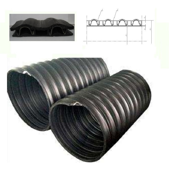 中空壁塑钢缠绕管是以中空聚乙烯(PE)板带为基体,用“Ω”形状的钢骨架为主要支撑结构,生产管道钢骨架原材料为镀锌钢带,采用缠绕成型工艺,经加工制成内壁平直光滑,外壁呈波纹状的中空壁塑钢缠绕聚乙烯管道(简称:“HWPSP”管道)